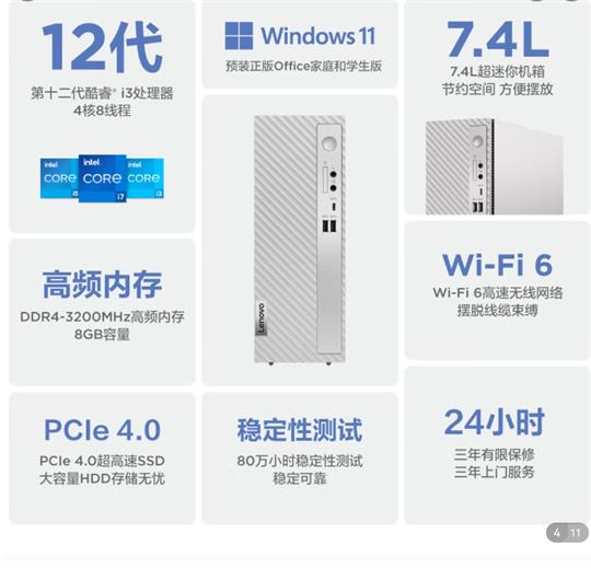 天逸510S商務(wù)臺(tái)式機(jī)(12代i3-12100 8G 1T+256G SSD wifi6 win11)單主機(jī)